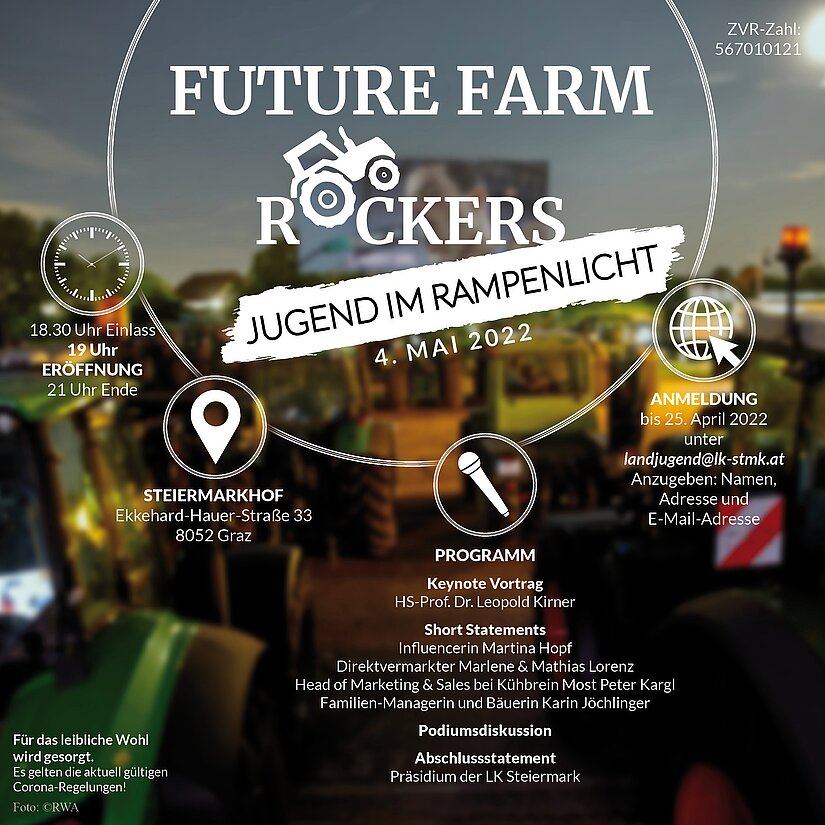 Die Landjugend Steiermark veranstaltet am 4. Mai 2022 um 19 Uhr am Steiermarkhof in Graz in Kooperation mit der Landwirtschaftskammer Steiermark die Veranstaltung „Future Farm Rockers – Jugend im Rampenlicht“.