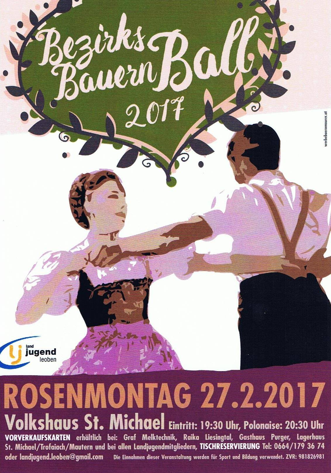 ... gibt´s am Rosenmontag beim traditionellen Bezirksbauernball der Landjugend Bezirk Leoben. Am Rosenmontag, 27. Februar 2017 geht´s im Volksheim St. Michael wieder hoch her: Beim Bezirksbauernball trifft sich Jung & Junggeblieben, Dirndl & Lederhosen und Stadt & Land. Mit der flotten Polonaise eröffnet die Landjugend um 20.30 Uhr das Tanzparkett. Die Gruppe "Steirerpower" sorgt bis in die frühen Morgenstunden für Stimmung im Saal. Für alle Jungen und Junggebliebenen gibt´s natürlich auch eine Disco
